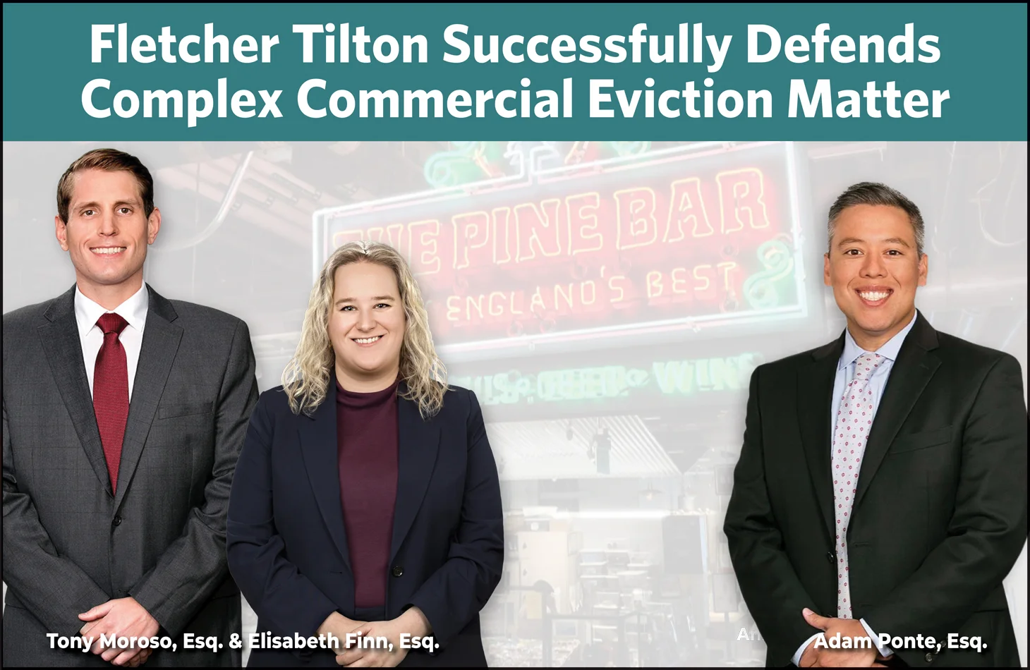 (April 7, 2026 – Boston, MA) Fletcher Tilton Attorneys Adam Ponte, Elisabeth Finn and Anthony Moroso successfully defend a complex commercial eviction matter pending before the Boston Municipal Court, Central Division, after concluding a three-day bench trial. The firm’s client, a well-known Boston restauranteur, owns and operates The Pine Bar, which is the only full liquor establishment within the Boston Public Market, located in the heart of Downtown Boston. The Market alleged that The Pine Bar failed to furnish mandatory financial records during the term of the occupancy; and as a result, attempted to halt all bar operations and seek to evict the business. The Court disagreed with the Market and found that The Pine Bar did not commit any material breach of the parties’ agreements. Further, the Court held that the Market lulled The Pine Bar into believing it was not required to deliver certain financial records for a period of three years, and that the bar did not commit any intentional breach. Ultimately, the Court ruled in favor of the firm’s client, entering a decision that The Pine Bar shall remain in possession of the subject premises. Congratulations to our talented attorneys, and especially to our client! See BPM Events LLC v. The Pine Bar LLC, Boston Municipal Court – Central, No. 2501SU000059 (Hon. Judge Steven M. Key).