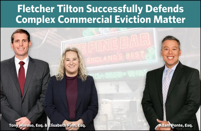 (April 7, 2026 – Boston, MA) Fletcher Tilton Attorneys Adam Ponte, Elisabeth Finn and Anthony Moroso successfully defend a complex commercial eviction matter pending before the Boston Municipal Court, Central Division, after concluding a three-day bench trial. The firm’s client, a well-known Boston restauranteur, owns and operates The Pine Bar, which is the only full…